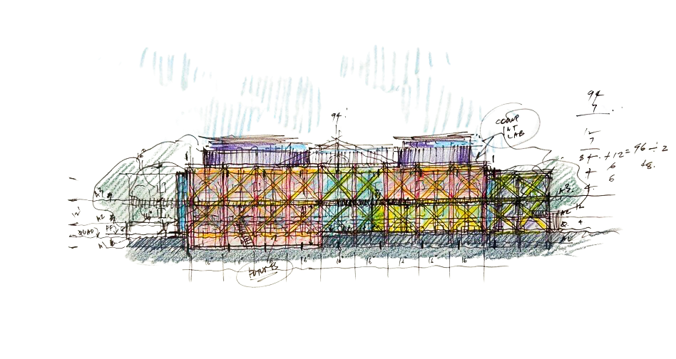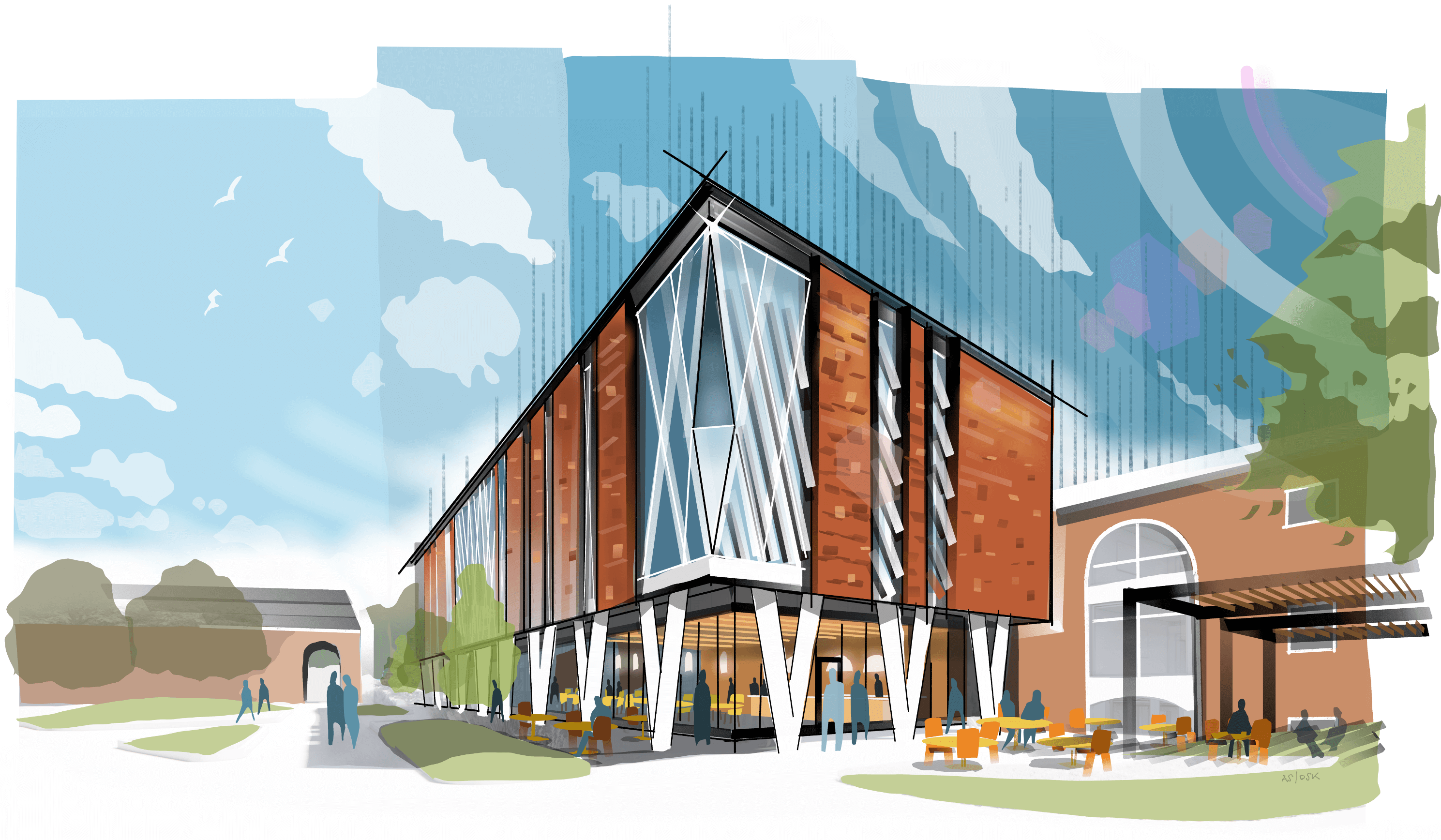 Early Concept Sketch of Adamian Academic Center – View from the Academic Quad