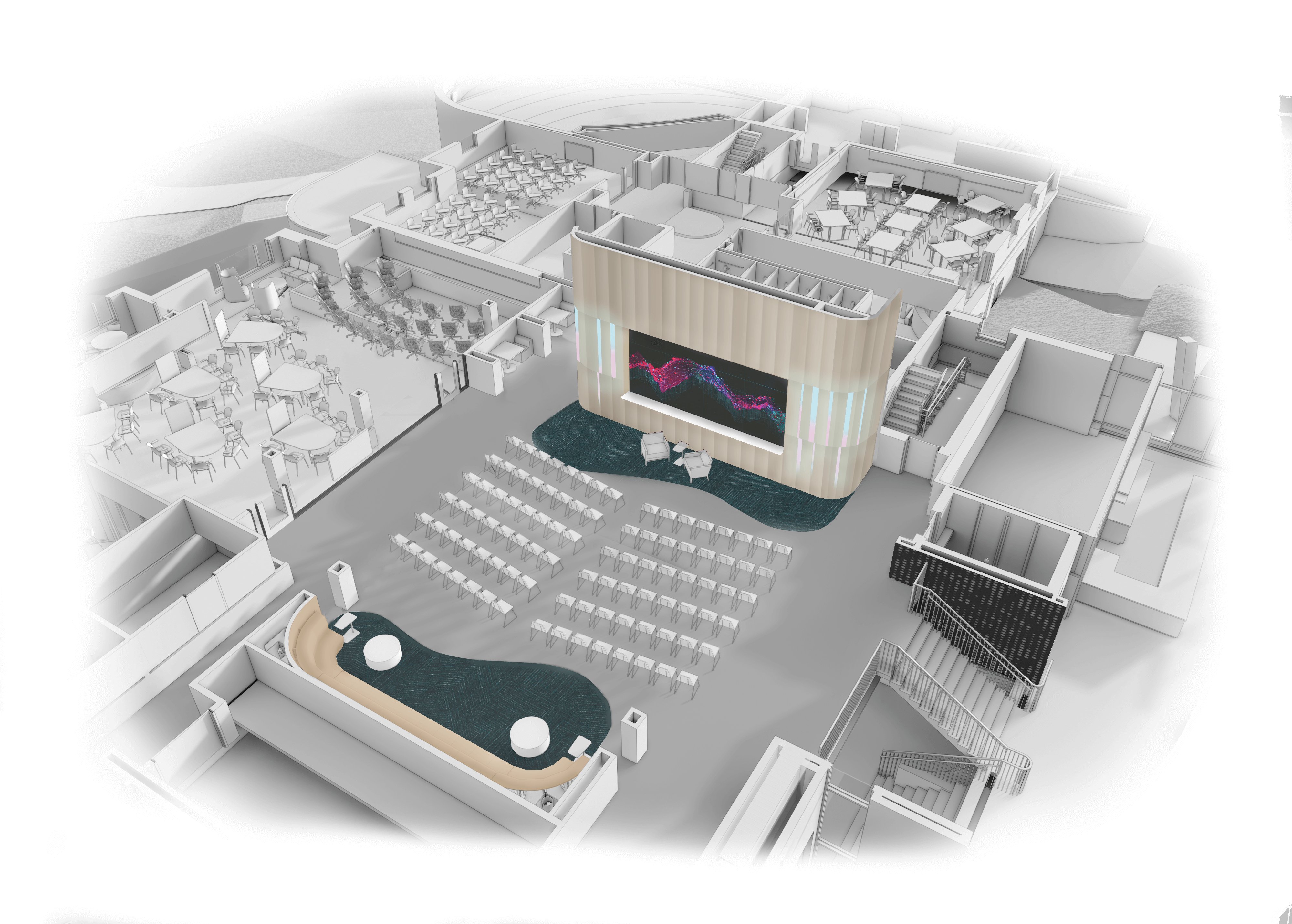 The transformation of Adamian will be the cornerstone of Bentley University’s Technology, Innovation, and Entrepreneurship initiative. This completely renovated and modernized academic center will offer dedicated spaces where every member of the community can innovate and perform their best work. Enhanced work areas for faculty and gathering spaces for students will be designed to foster creativity and multi-disciplinary learning across areas of study. Additionally, the new Adamian Center will be anchored by signature spaces that allow for exploration at the intersection of business, technology, and innovation. Many key academic centers will be integrated into a central hub of collaboration and advanced learning that will benefit all students and faculty.